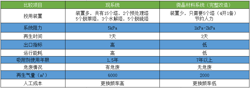 净化后的煤气经过煤压机压缩后,送到燃机发电。吸附剂半年到一年更换一次。2016年升级改造煤气净化工艺,采用我公司研发的国际上尖端的疏水型微晶体材料吸附剂技术,同事选择性的吸附苯、萘、焦油及重质芳烃、硫化氢、有机硫、氨气、氢氰酸等混合气体的工作,吸附塔使用个数减少了8个,吸附剂的使用量仅为原来的20%。以前的八个塔中,两两循环再生,现在减少为四个塔单循环再生,热换器、加热器、冷却器也相应减少,再生周期由以前的7天缩短为3天,蒸汽使用量减少,吸附剂使用效率显著提高。吸附剂5-7年更换一次,不仅显著降低了环保危废的处理量,而且节约了大量人力物力,装置运行成本也大大降低。