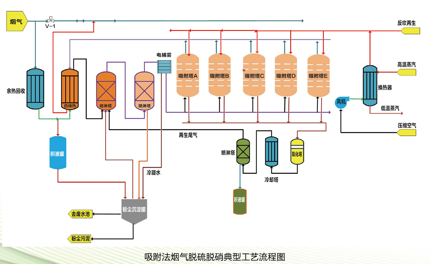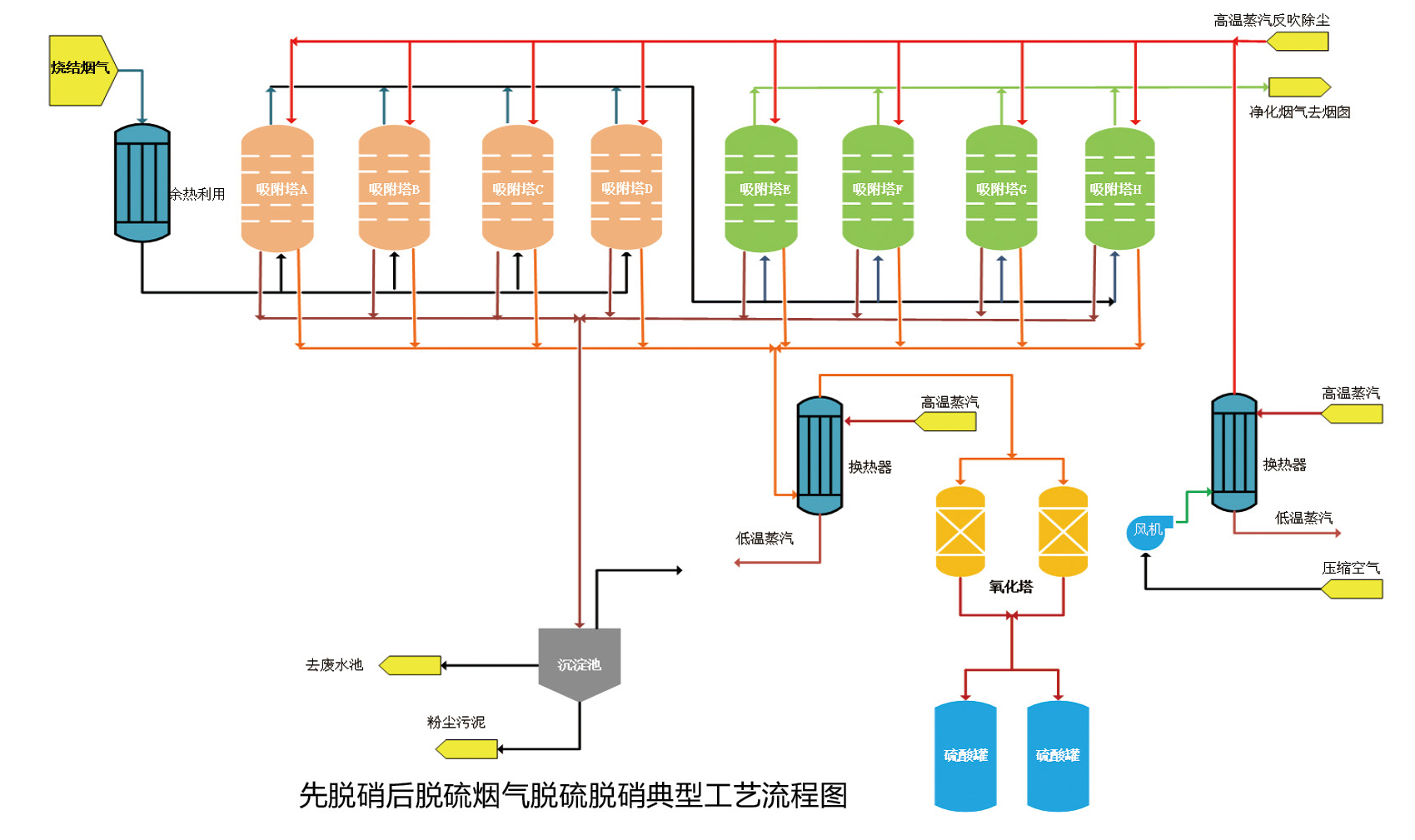 适应于烟气温度较低(100℃左右或以内)或先对烟气降温到100℃以内,然后采用微晶材料吸附,吸附烟气中氮氧化物及硫化物,经过微晶材料吸附后烟气达标排放。吸附塔饱和后,通过蒸汽换热空气反吹吸附塔,反吹出来的硫化物、氮氧化物经氧化塔氧化,喷淋后进制酸或盐。